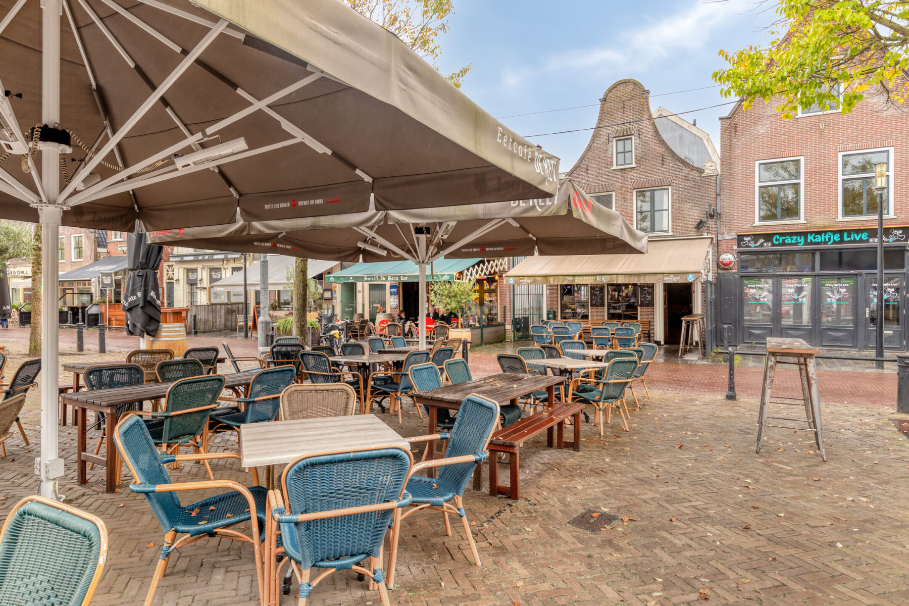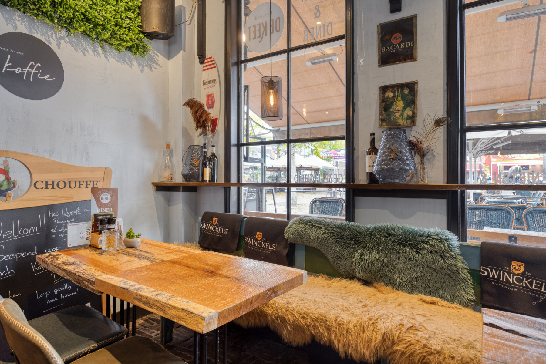 Aan de voorzijde bevindt zich een groot en zonnig terras, waarbij het mogelijk is om deze in de winter om te toveren naar een ‘winterterras’. Binnen biedt de zaak een ruime zitgelegenheid met centraal geplaatste bar. Aan de achterzijde bevinden zich de keuken, toiletgroepen, tankbierinstallatie en extra opslagruimte. Via een trap is de eerste verdieping bereikbaar, waar zich een personeelsruimte, opslag-/kantoorruimte en een inloopkoelcel bevinden.