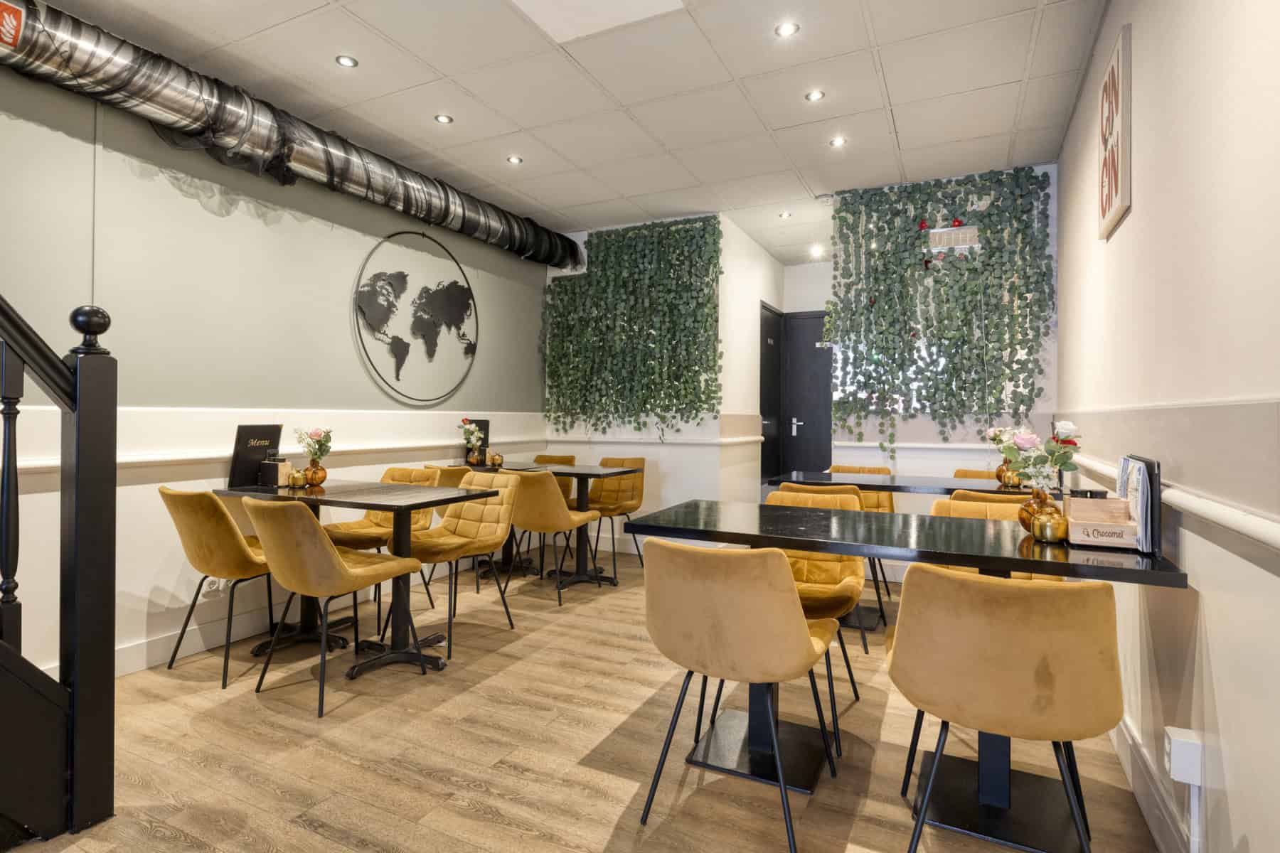 Bij binnenkomst bevindt men zich in het uitgifte- en verkoopgedeelte, met aan de linkerzijde een bar-/uitgifteopstelling. Aan de rechterzijde bevindt zich het zitgedeelte waar circa 15 tot 20 gasten kunnen plaatsnemen. Aan de achterzijde zijn nog eens 16 zitplaatsen mogelijk. Daarnaast zijn er twee toiletten met voorportaal aanwezig.